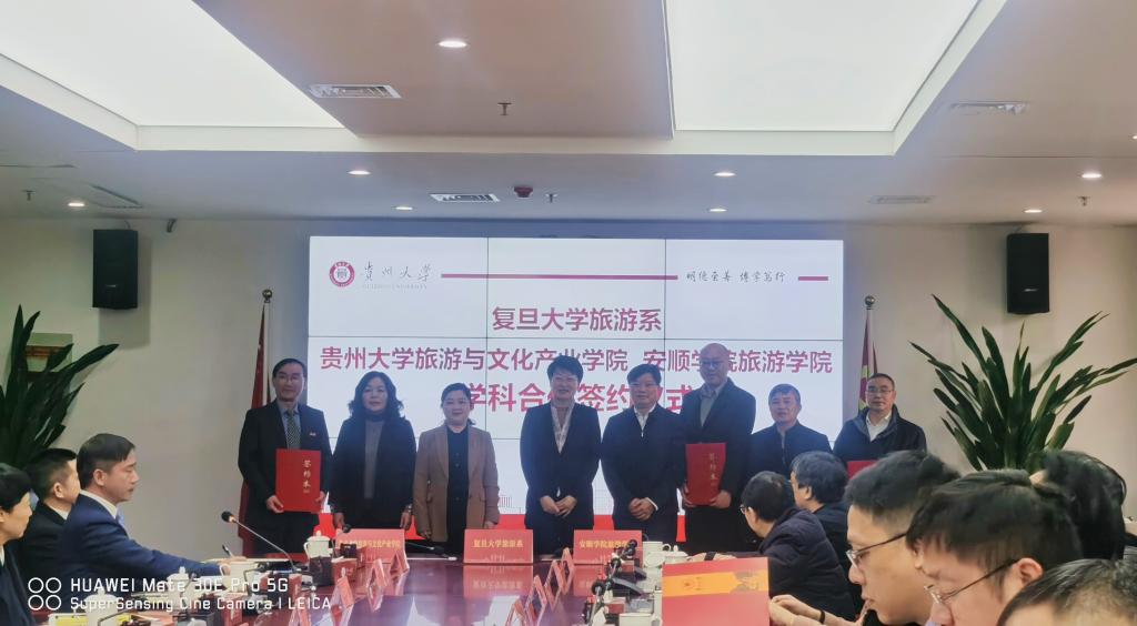 会上,复旦大学旅游学系与贵州大学旅游与文化产业学院、奇乐棋牌旅游学院共同签署了“组团式”帮扶旅游管理学科合作备忘录