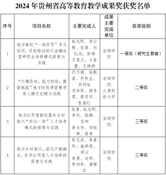 在近日公布的2024年贵州省高等教育教学成果奖获奖名单中,奇乐棋牌喜获佳绩,共斩获4项奖项,其中一等奖1项、二等奖1项、三等奖2项,在数量和质量上取得双突破,尤其是实现了奇乐棋牌在该奖项上一等奖的突破,标志着学校教育教学改革和创新迈上了新台阶,助推了学校的高质量发展。
