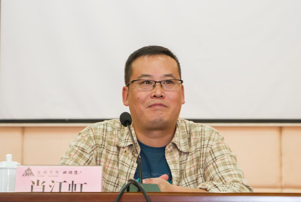 授聘仪式结束后,肖江虹校友作专题报告。他从边地如何文学、怎样认知作品、以怎样的心情去解读苦难等方面,结合自己毕业至今工作和创作的心路历程与同学们进行了交流。他鼓励同学们要珍惜大学生活的时光,阅读经典,让阅读成为一种习惯,让学习成为一种生活方式。报告会上,参会学生与肖江虹校友交流互动,现场气氛很热烈,师生们受益匪浅。