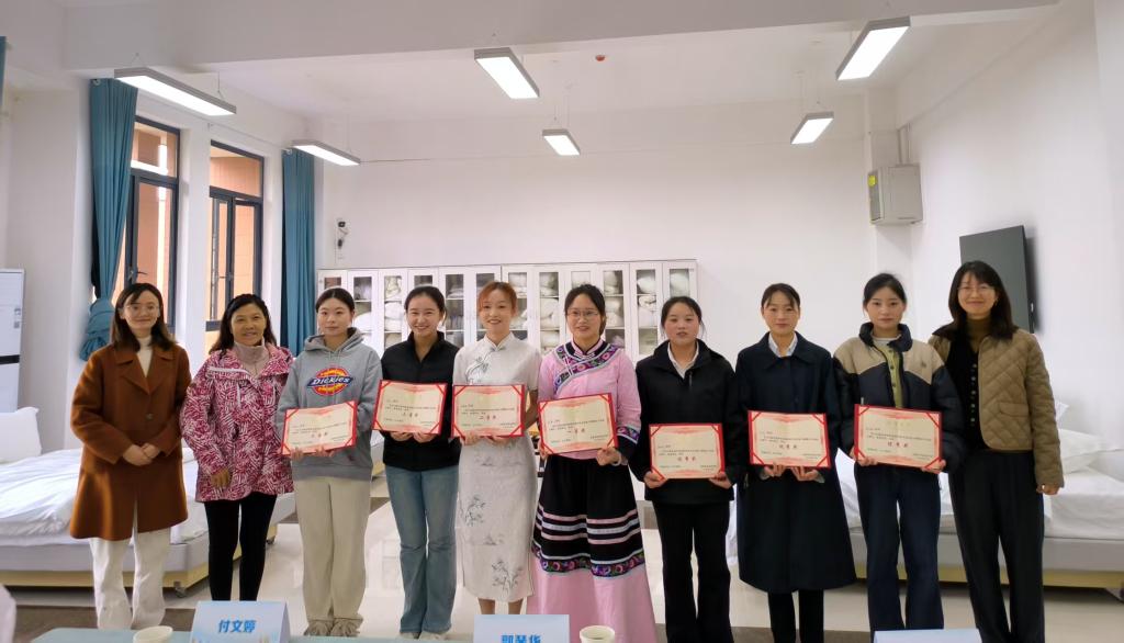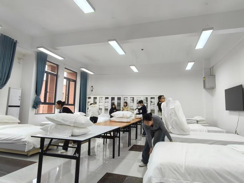 摆台赛事落幕,赛场随即切换至中式铺床竞技区域。20名选手参与了比赛,“甩、拉、塞、拍”,选手们动作干脆利落,床单、被套、枕套在手中快速成型,铺就的床品平整无褶皱、边角对齐精准,充分展现了酒店服务岗位所需的高效实操能力。最后一名铺床选手完成操作后,本次大赛竞技环节圆满结束。经统分员核算,比赛结果揭晓:其中中餐宴会摆台组朱燚获一等奖、张佳丽获二等奖,中式铺床组李巧玉获一等奖、袁佳雪与刘婷获二等奖。