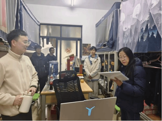 当晚,走访队伍分组走进各栋学生宿舍。学院领导与同学们亲切交谈,细致询问假期生活与返校适应情况,逐一核实各班返校人数,确保新学期学生管理平稳有序。针对宿舍环境卫生,老师们对照酒店管理专业的高标准,对物品收纳、清洁死角、安全隐患等进行了细致检查,并现场提出优化建议,引导学生将专业素养内化于心、外化于行,将宿舍打造成锤炼职业习惯的“第一实训室”。